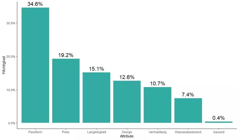 In diesem Beispiel ist die Eigenschaft „Passform“ mehr als doppelt so wichtig wie das Attribut „Langlebigkeit“ – ein eindeutiges Verhältnis. Die Werte der einzelnen Attribute sind durch ihre Normierung problemlos interpretierbar, da sie von 0% bis 100% reichen, wobei ein höherer Wert auf eine wichtigere Eigenschaft hinweist.