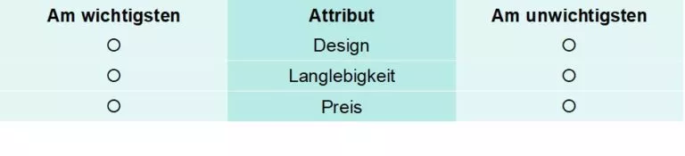 In der Marktforschung geht es häufig darum, die Wichtigkeit von verschiedenen Attributen festzustellen und diese der Reihe nach zu sortieren. Produkte und Dienstleistung können diverse Eigenschaften haben, die für den Kunden unterschiedlich wichtig sind.